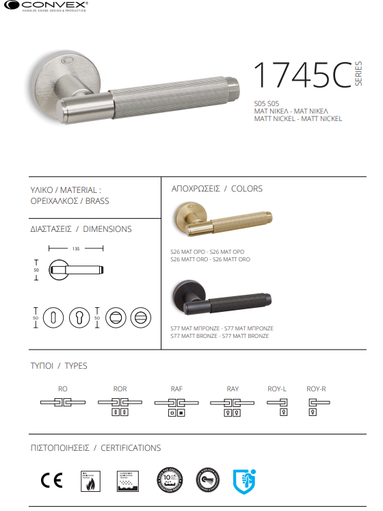 Η σειρά 1745C χαρακτηρίζεται από το σύγχρονο σχεδιασμό της με παράλληλες αυλακώσεις, που εξασφαλίζουν εργονομική λαβή και πολυτελή αίσθηση. Κατασκευασμένο από ορείχαλκο, προσφέρει ανθεκτικότητα και κομψότητα σε κάθε εσωτερικό χώρο. Ιδανικό για μοντέρνες και μίνιμαλ διακοσμήσεις, αποτελεί την τέλεια επιλογή για σπίτια, γραφεία και επαγγελματικούς χώρους.