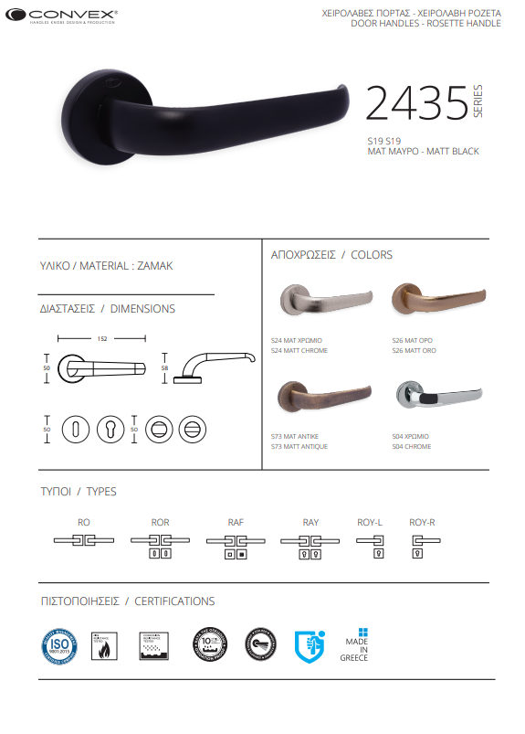 Η σειρά 2435 διαθέτει έναν κομψό, καμπύλο σχεδιασμό που συνδυάζει τη μορφή με τη λειτουργικότητα. Το εργονομικό της σχήμα εξασφαλίζει μια άνετη λαβή, μειώνοντας την πίεση στο χέρι και τον καρπό με κάθε χρήση. Κατασκευασμένη με ακρίβεια, οι ομαλές καμπύλες και τα καλοφτιαγμένα άκρα της λαβής προσθέτουν μια πινελιά κομψότητας σε κάθε πόρτα, συνδυάζοντας αρμονικά τόσο με μοντέρνους όσο και με παραδοσιακούς εσωτερικούς χώρους. Ο καινοτόμος σχεδιασμός όχι μόνο ενισχύει την αισθητική εμφάνιση αλλά και προσφέρει μια διαισθητική και άκοπη εμπειρία χρήσης, καθιστώντας την ιδανική επιλογή για όσους εκτιμούν τόσο το στυλ όσο και την άνεση στην καθημερινότητα τους.
