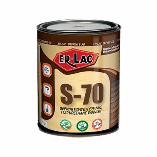 Το S-70 είναι βερνίκι πολυουρεθάνης 1 συστατικού για εσωτερικές και εξωτερικές ξύλινες επιφάνειες. Είναι κατάλληλο για όλες τις ξύλινες επιφάνειες όπως κουφώματα, κουπαστές, ξύλινες οροφές, μικροέπιπλα, επενδύσεις τοίχων κ.α. και για φρεσκάρισμα επίπλων. Αποτελεί την ιδανική λύση κυρίως για ξύλινες επιφάνειες εξωτερικού χώρου αφού παρέχει μακροχρόνια προστασία και δημιουργεί μια γεμάτη πολύ γυαλιστερή ή σατινέ και σκληρή επιφάνεια η οποία δεν χαράσσεται και αντέχει στα χτυπήματα. Παρουσιάζει επίσης εύκολη εφαρμογή και μεγάλη απόδοση.