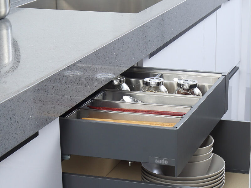 Η δυνατότητα χρήσης της ιδιαίτερης πιατοθήκης της εταιρείας μας για την τοποθέτηση των αντικειμένων στα βαγονέτα, σε συνδυασμό με τον πρωτότυπο αντιολισθητικό πάτο AGOFIBRE της AGOFORM, δίνουν εξαιρετική αίσθηση. Η κουταλοθήκη της εταιρείας Essetre που είναι ακριβώς στον ίδιο χρωματισμό με τα πλαϊνά τους, ολοκληρώνει το εντυπωσιακό σύστημα συρταριών.