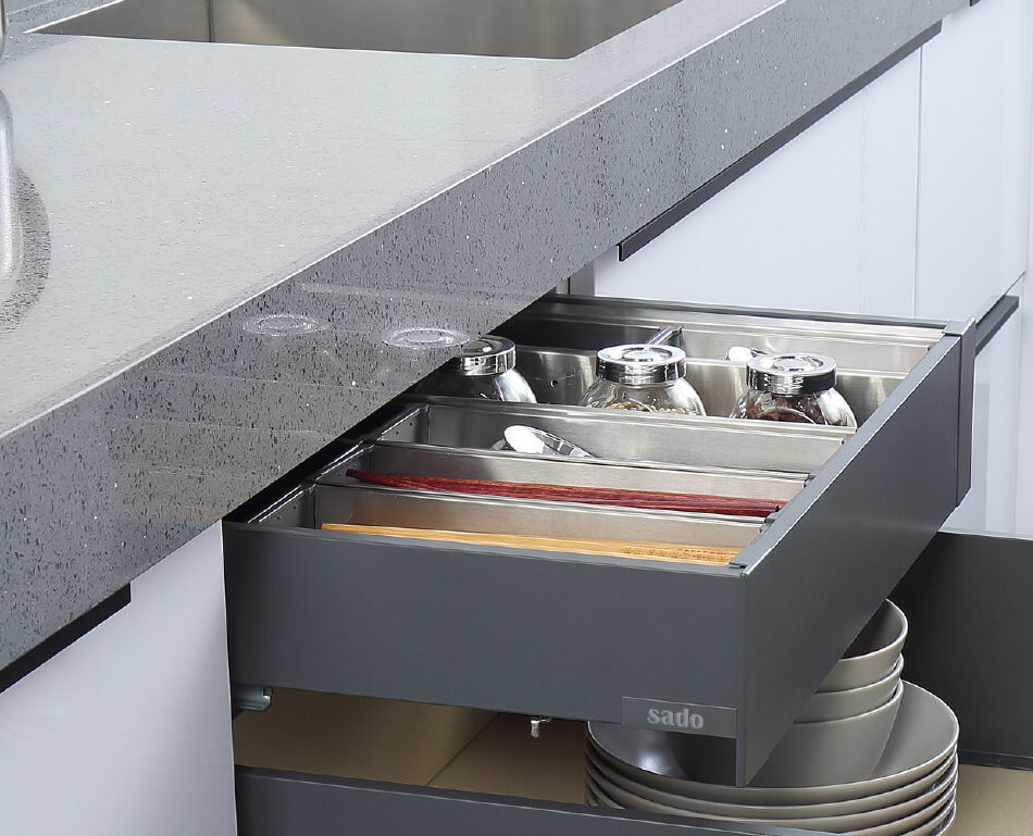 Διαθέτει μοντέρνο design με λεπτό μεταλλικό πλαϊνό, άριστης ποιότητας οδηγούς 40kg για ομαλή κίνηση και σύστημα soft close. Προσφέρει μεγάλη σχεδιαστική ευελιξία και είναι κατάλληλο για κουζίνες, ντουλάπες και κάθε τύπο επίπλου.